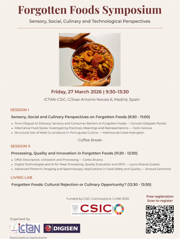 No dia 27 de março de 2026, no mesmo local, os investigadores participaram igualmente no Symposium “Forgotten Foods: Value, Culture and Alternative Food Practices”, que reuniu investigadores e especialistas de diversas áreas para discutir o papel dos alimentos esquecidos e dos co-produtos na transição para sistemas alimentares mais sustentáveis, resilientes e culturalmente informados. Durante o simpósio, Alexandra Seabra Pinto e Matheus Koengkan apresentaram a investigação intitulada “Structural Use of Meat Co-products in Portuguese Cuisine”, na qual analisam o papel estrutural dos co-produtos de carne na gastronomia portuguesa, destacando o seu valor cultural e o seu potencial contributo para a sustentabilidade alimentar.