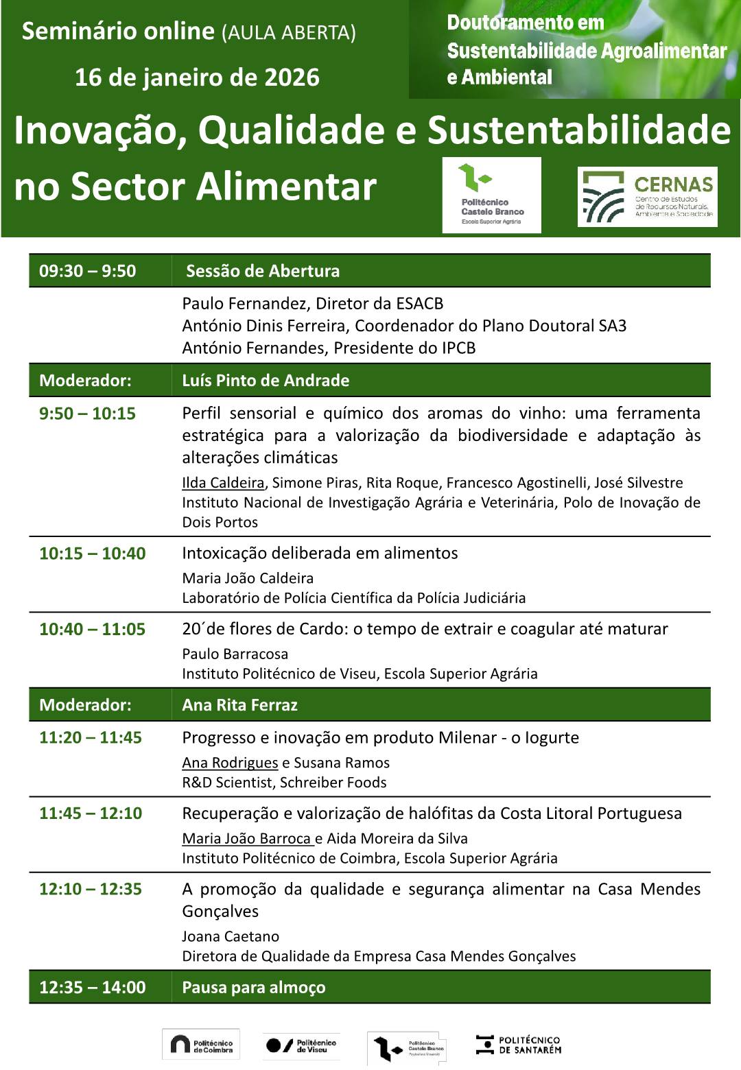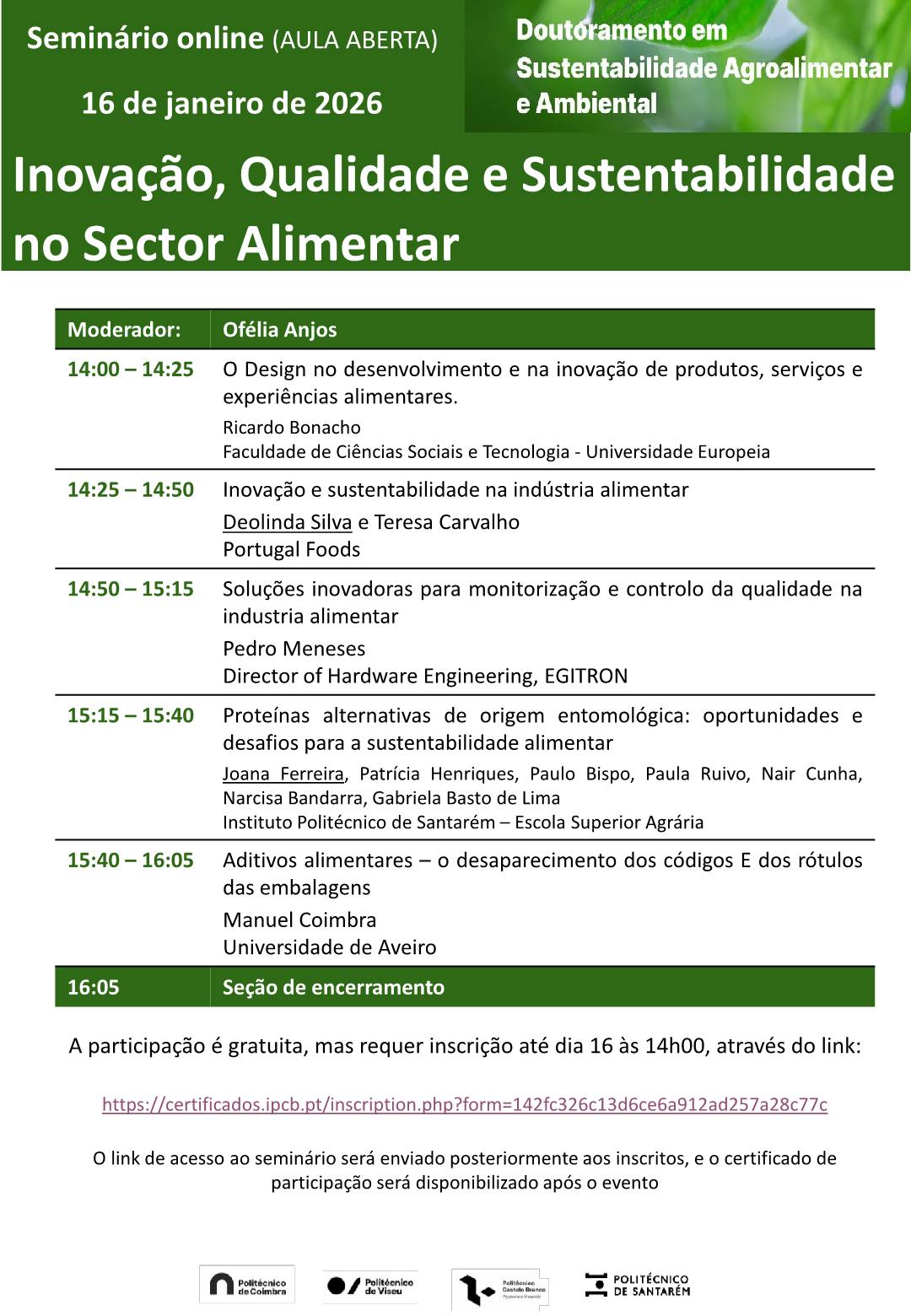 No dia 16 de janeiro de 2026 realiza-se o seminário online “Inovação, Qualidade e Sustentabilidade no Setor Alimentar”, integrado no Doutoramento em Sustentabilidade Agro-Alimentar e Ambiental.