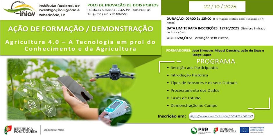 O Polo de Inovação de Dois Portos/Estação Vitivinícola Nacional irá realizar uma Ação de Formação/Demonstração sobre AGRICULTURA 4.0 – A TECNOLOGIA EM PROL DO CONHECIMENTO E DA AGRICULTURA no dia 22 de outubro de 2025.