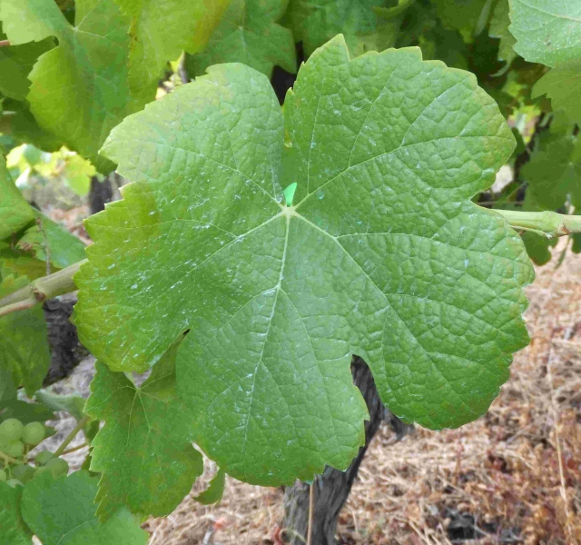 Folha adulta de tamanho médio, pentagonal, com cinco lóbulos; limbo verde médio, irregular, medianamente bolhoso, página inferior com média densidade de pelos prostrados; dentes curtos e convexos; seio peciolar aberto, com a base em V, seios laterais abertos em V.