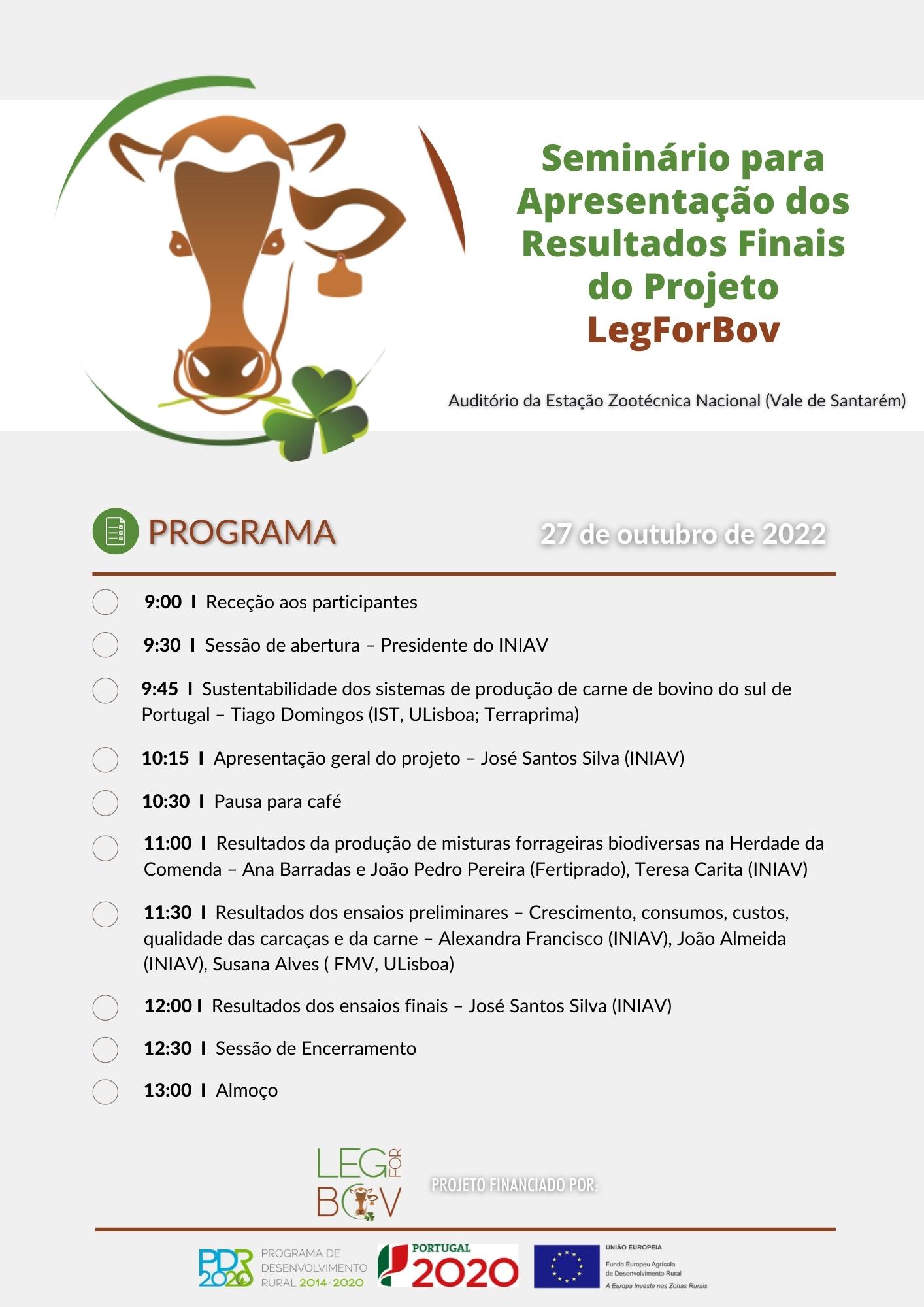 O projeto LegForBov dá o mote ao seminário de apresentação de resultados finais, a decorrer no próximo dia 27 de outubro de 2022 (quinta-feira), a partir das 9h00, no Auditório da Estação Nacional Zootécnica (Vale de Santarém). O seminário, que será presencial, tem entrada livre, mas inscrição obrigatória através do formulário disponível aqui.
