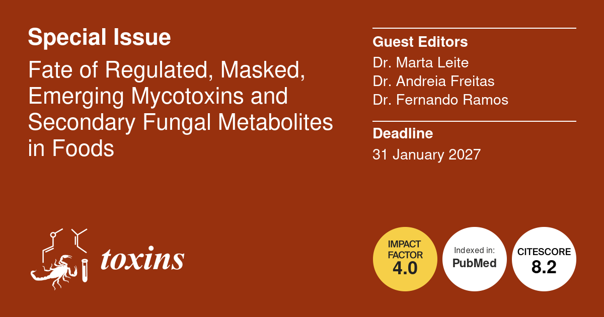 Encontra-se aberta uma Special Issue na revista Toxins (MDPI) dedicada a: “Fate of Regulated, Masked, Emerging Mycotoxins and Secondary Fungal Metabolites in Foods”